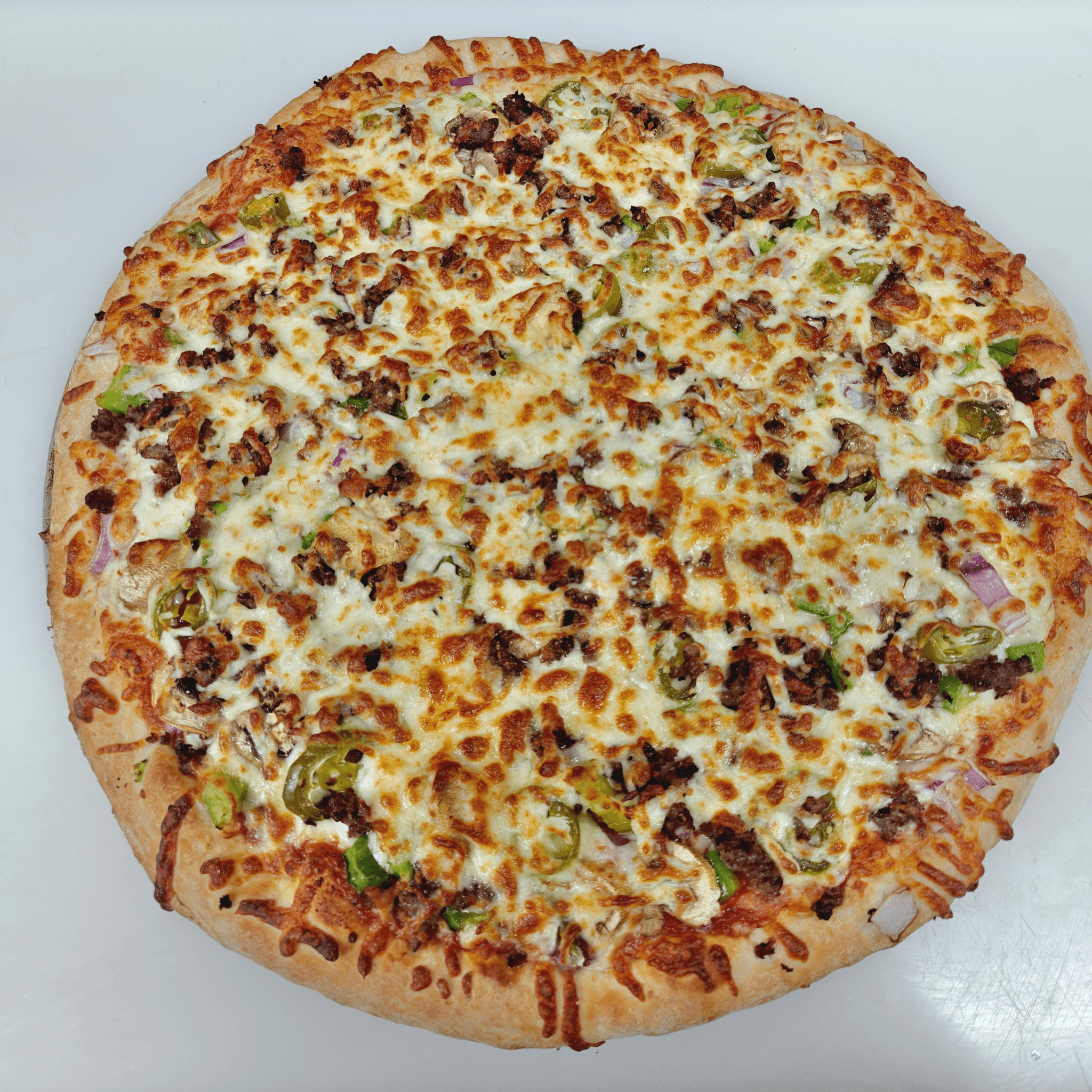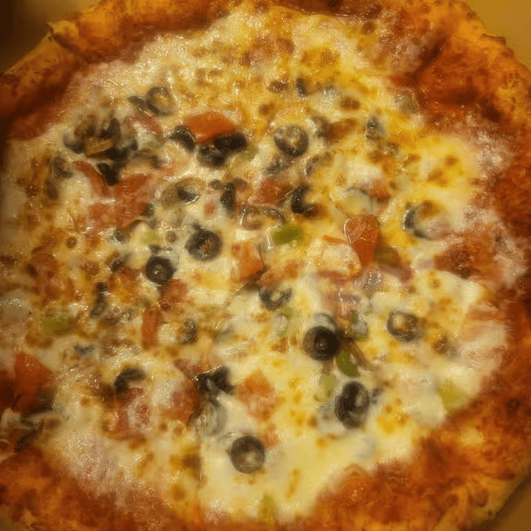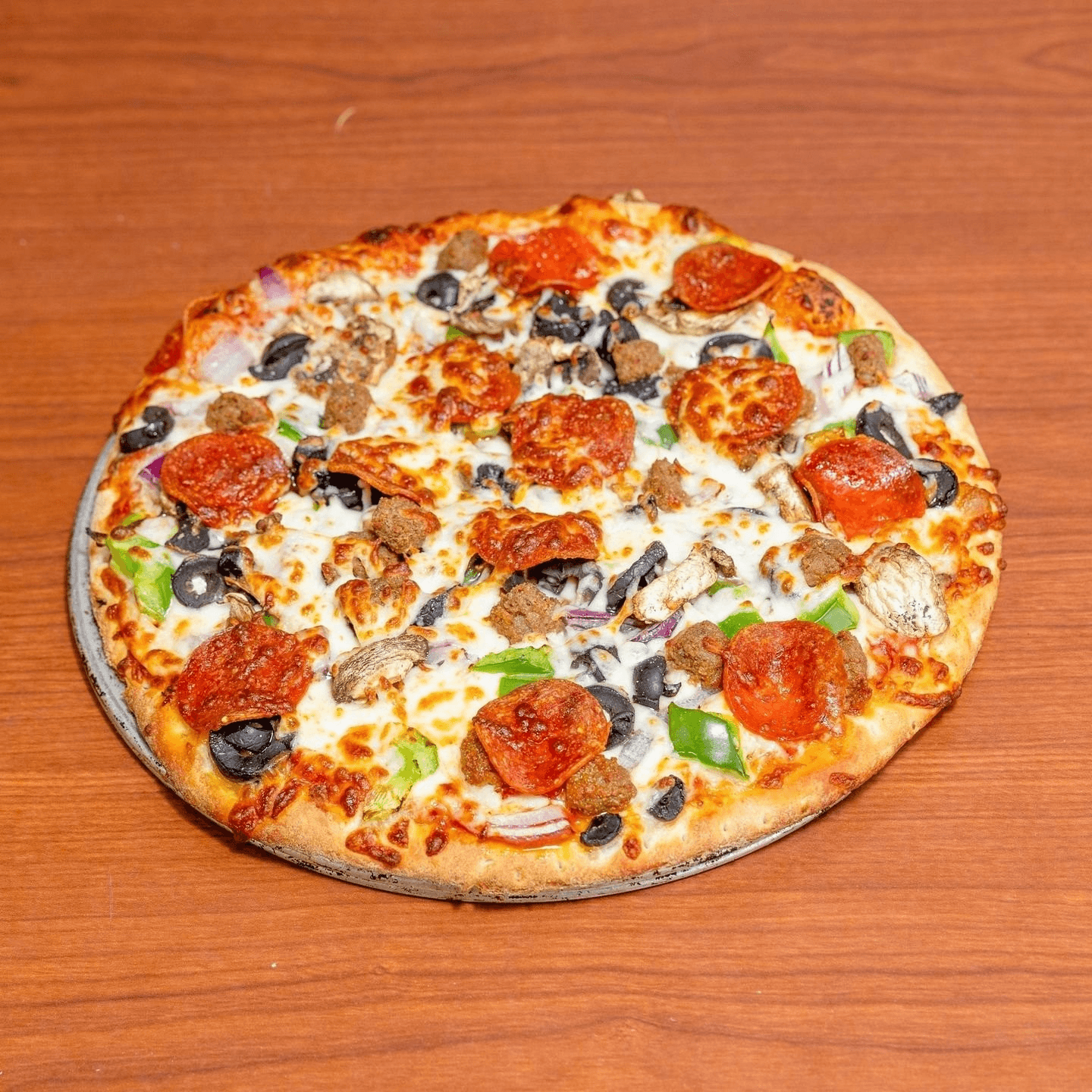 Pepperoni, sausage, mushrooms, onion, green pepper, and black olives