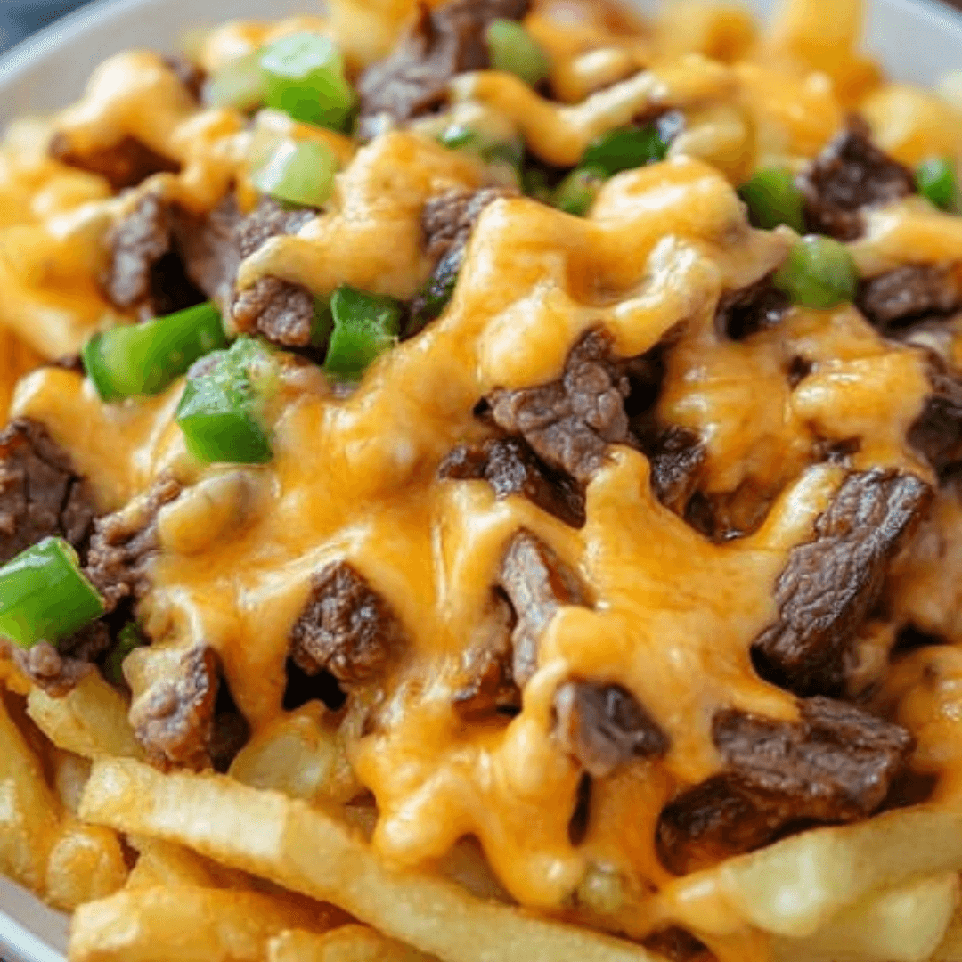 Fries topped with thinly sliced steak and melted cheese
