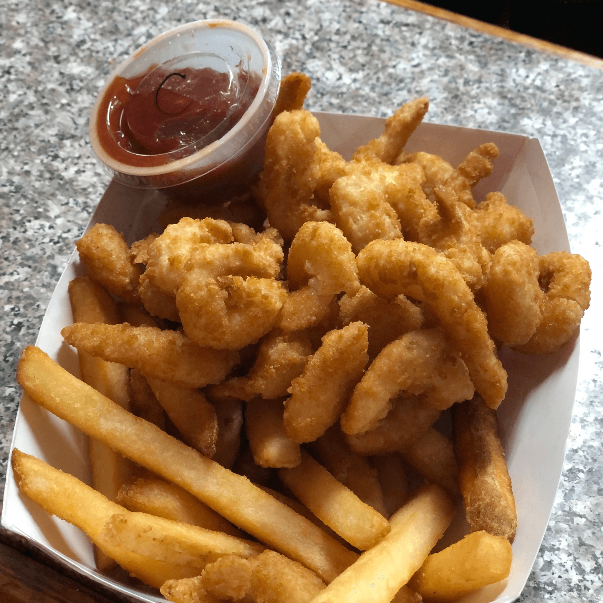 20 pieces of fried shrimp with fries. Cocktail sauce on the side